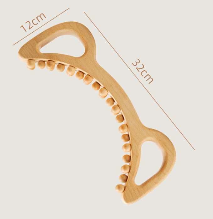 Ce masseur bois est conçu pour accompagner des gestes réguliers et appuyés sur les zones larges du corps grâce à sa forme demi-lune, ses picots en bois et sa prise en main à deux poignées.